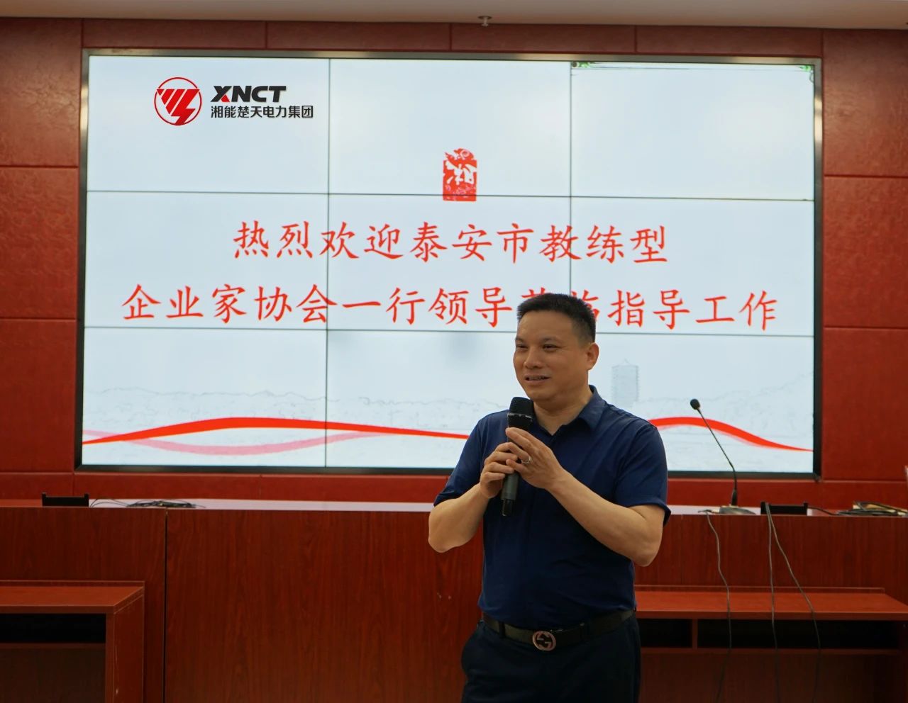 6月22日上午,由山東泰安巨鼎有限公司董事長(zhǎng)、泰安市教練型企業(yè)家協(xié)會(huì)會(huì)長(zhǎng)杜欣濤帶隊(duì)泰安市教練型企業(yè)家協(xié)會(huì)一行成員組49人蒞臨湘能楚天電力集團(tuán)參觀指導(dǎo)工作,長(zhǎng)沙市湘能楚天公益服務(wù)中心理事長(zhǎng)、湘能楚天電力集團(tuán)董事長(zhǎng)陳偉其、行政后勤中心總監(jiān)劉正安等陪同。