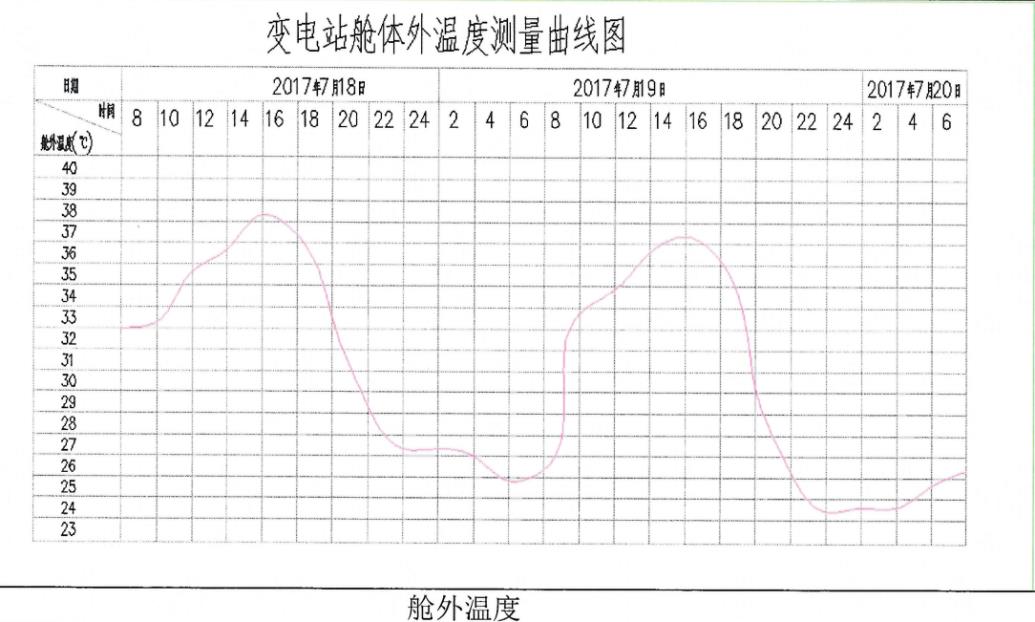 湘能楚天預制艙委托江蘇省江測檢測技術服務有限公司就預制艙的內部溫濕度的恒定性進行現(xiàn)場測試驗證。選取夏季節(jié)做了艙體的溫升試驗, 測溫如下圖所示,測溫列表如下,可以看出:外部環(huán)境的溫差變化在14攝氏度左右時,艙內溫度的變化在0.5攝氏度左右。